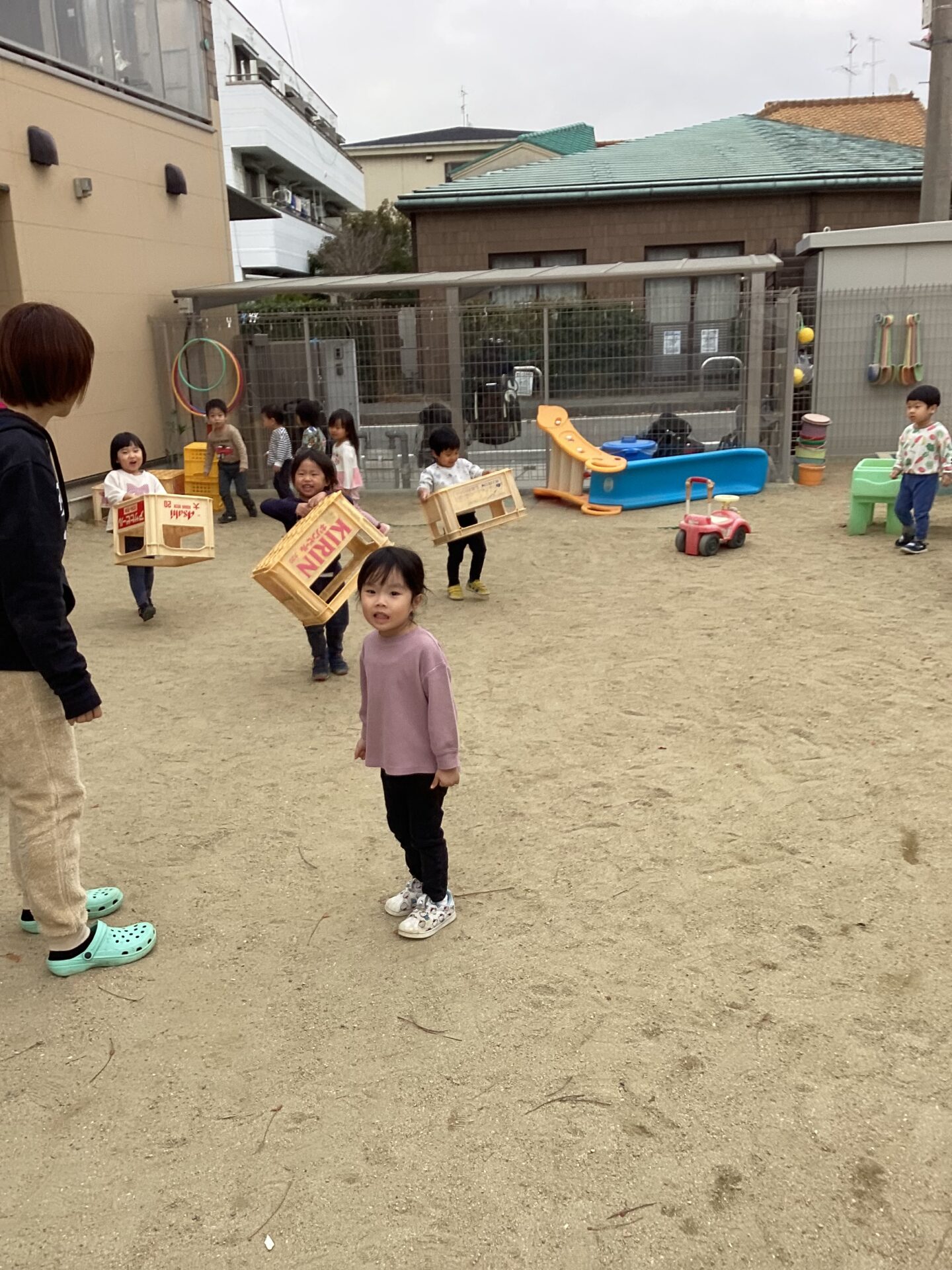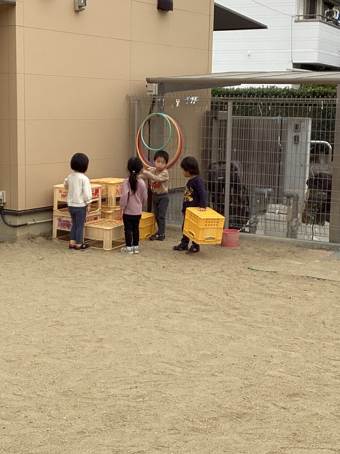 すると、、園庭に使えそうなものがないか走って探しに行きました。