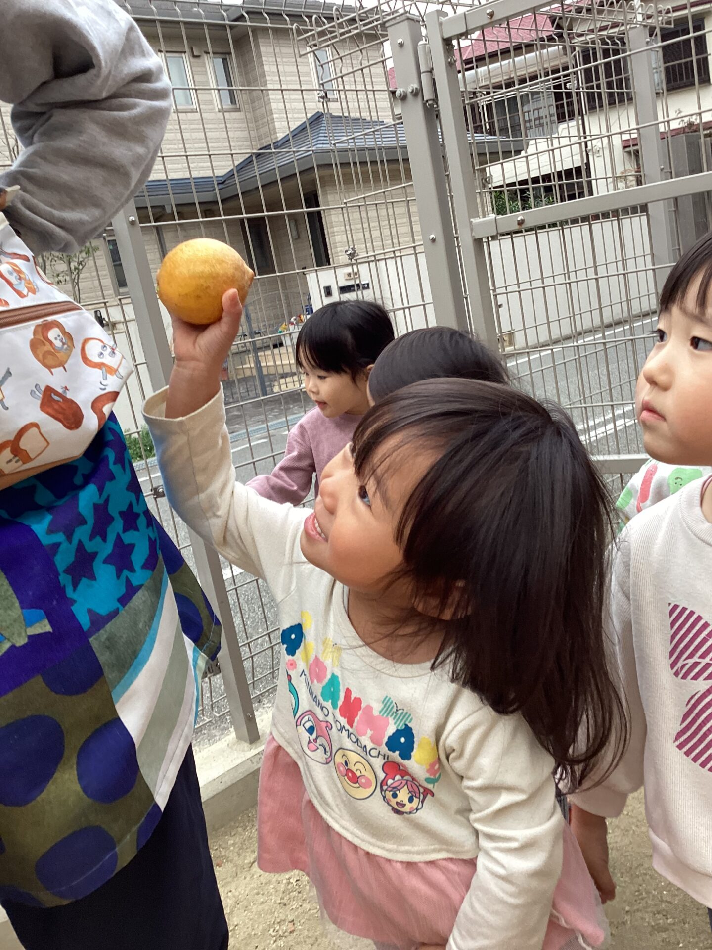 園庭に出てまずはみんなでどのレモンにするのか話し合いをしました。「どのレモンが大きいか」「どれが一番黄色いか」など色々比べました。みんなで話し合い比較的大きなレモンが選ばれました‼︎