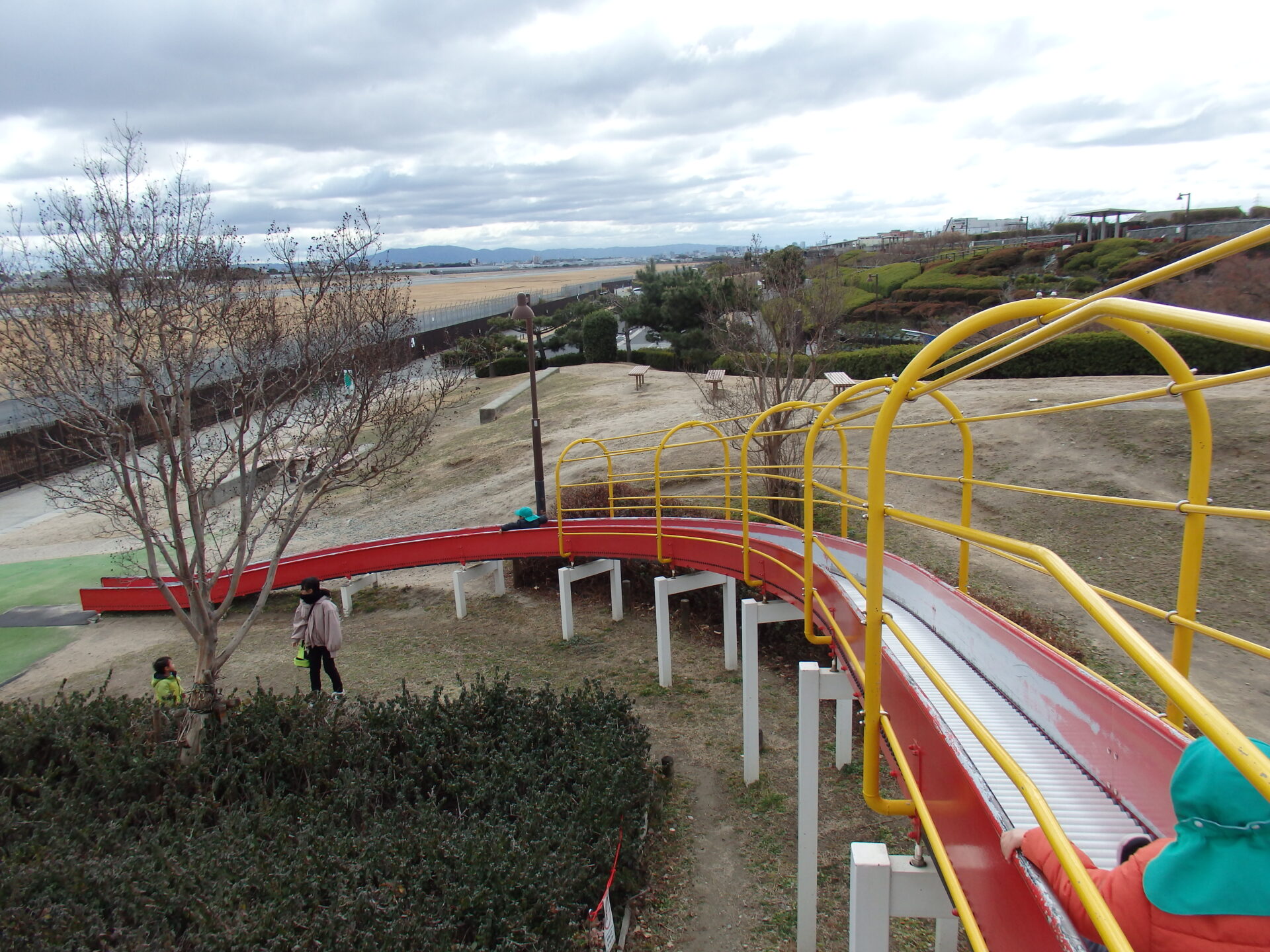スカイパーク内にある冒険の丘に到着すると、隣がすぐ飛行場で、離発着の飛行機がたくさん見れました!公園内にある長いローラーコースターと大きな滑り台があり、そちらをメインに遊びました。