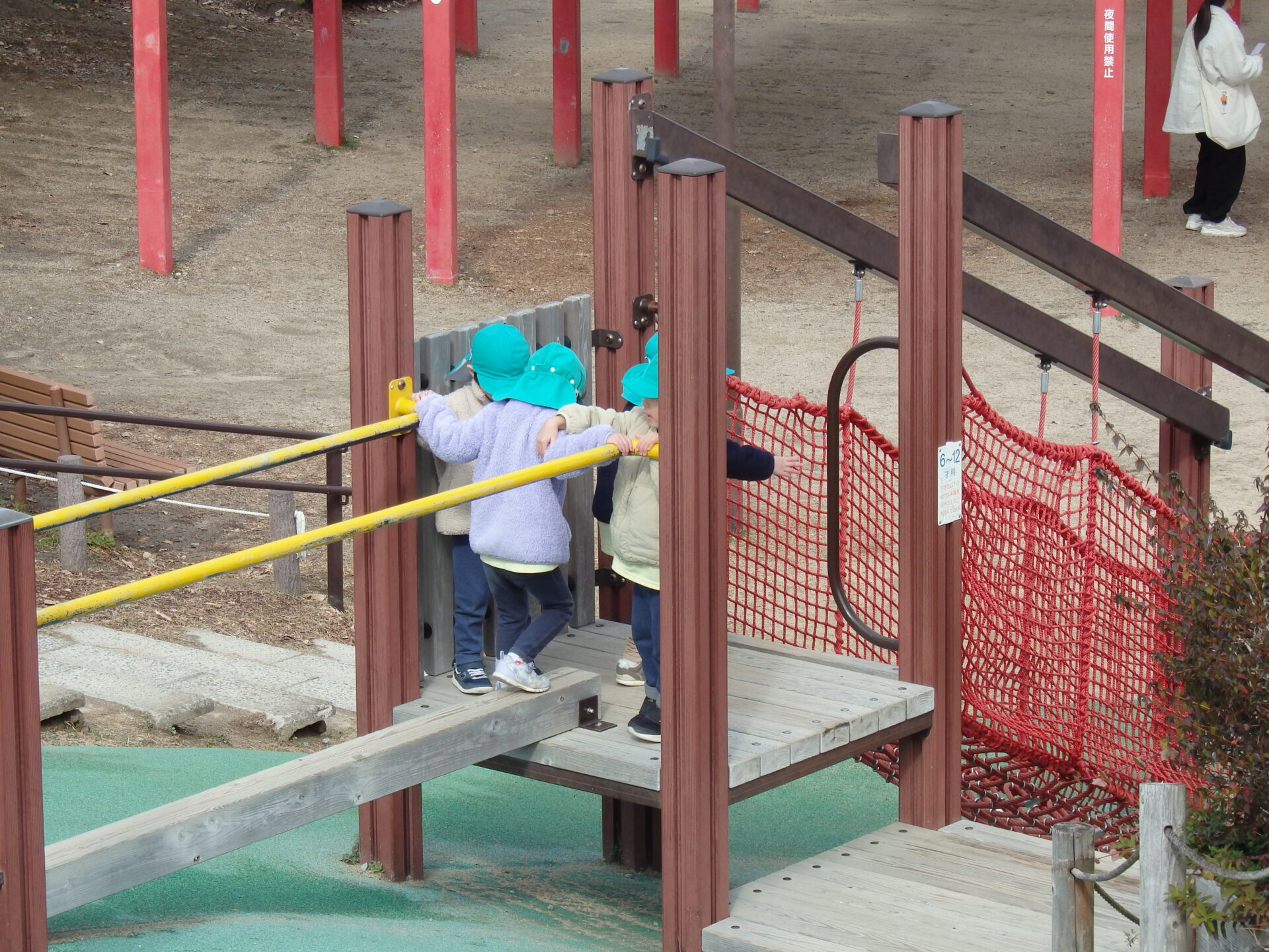 ローラー滑り台に登るまでに、ネットの橋や一本橋を渡るのですが、順番を守ったり