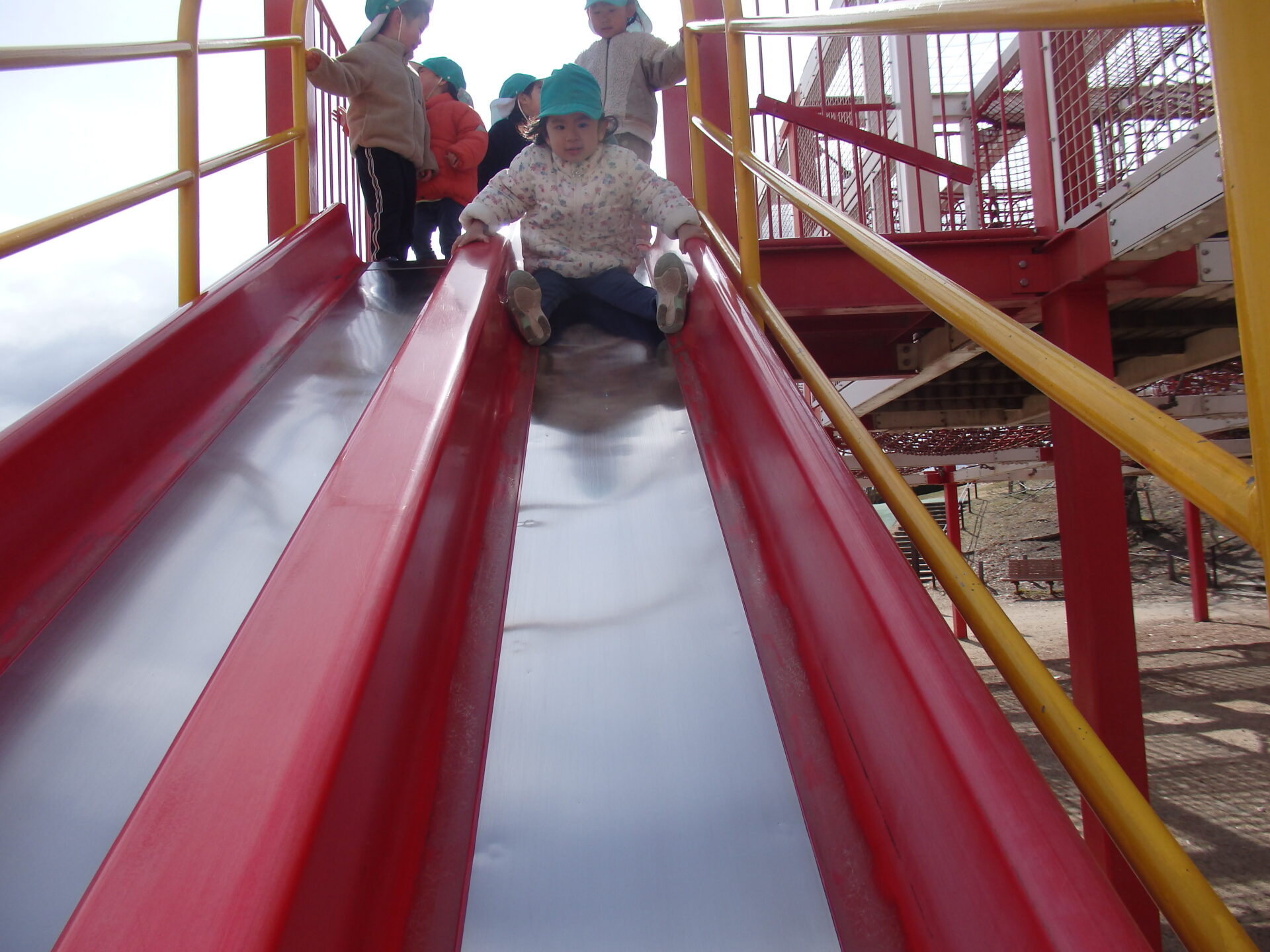 大きい長い滑り台もスピードが早くて、隣同士座って一緒に滑るのが楽しかったようです♪