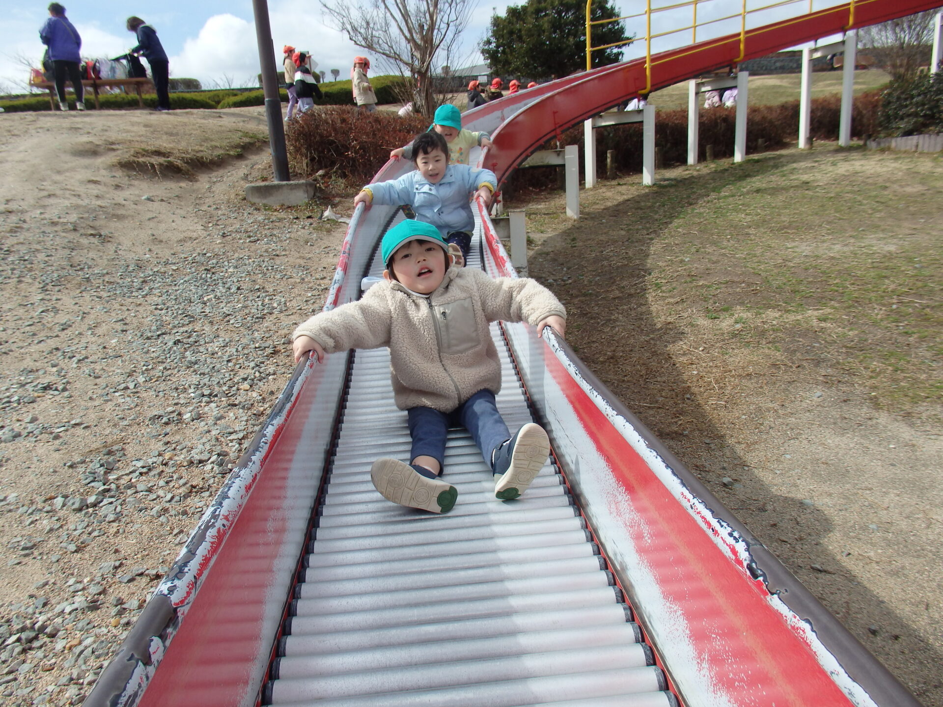 順番に並んで出発!「わーい!」という声が響き渡るほど子どもたちお気に入りで、何度も滑っていました。