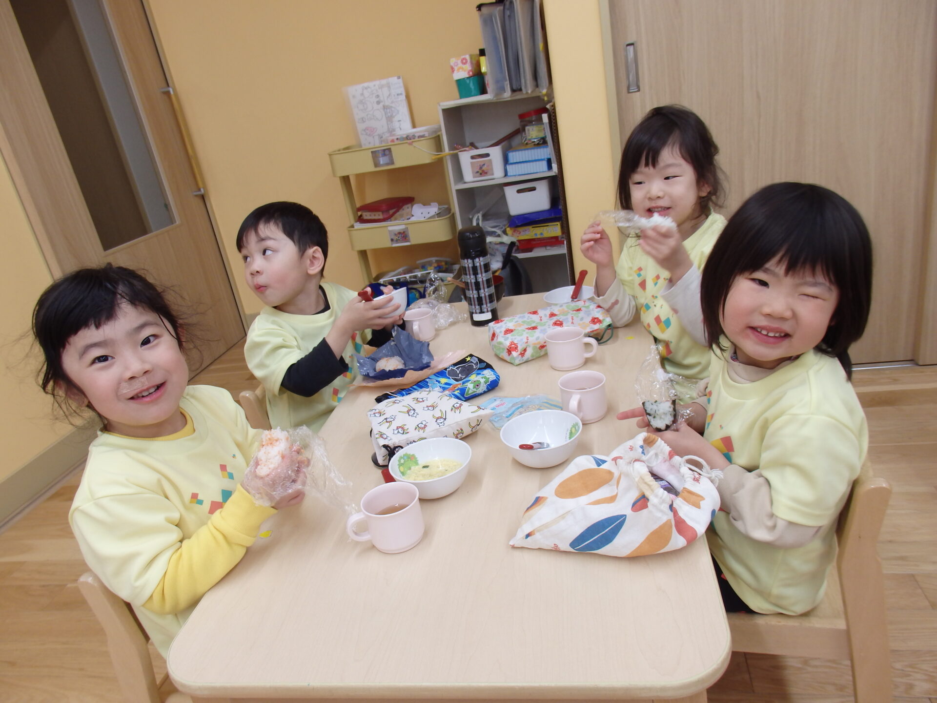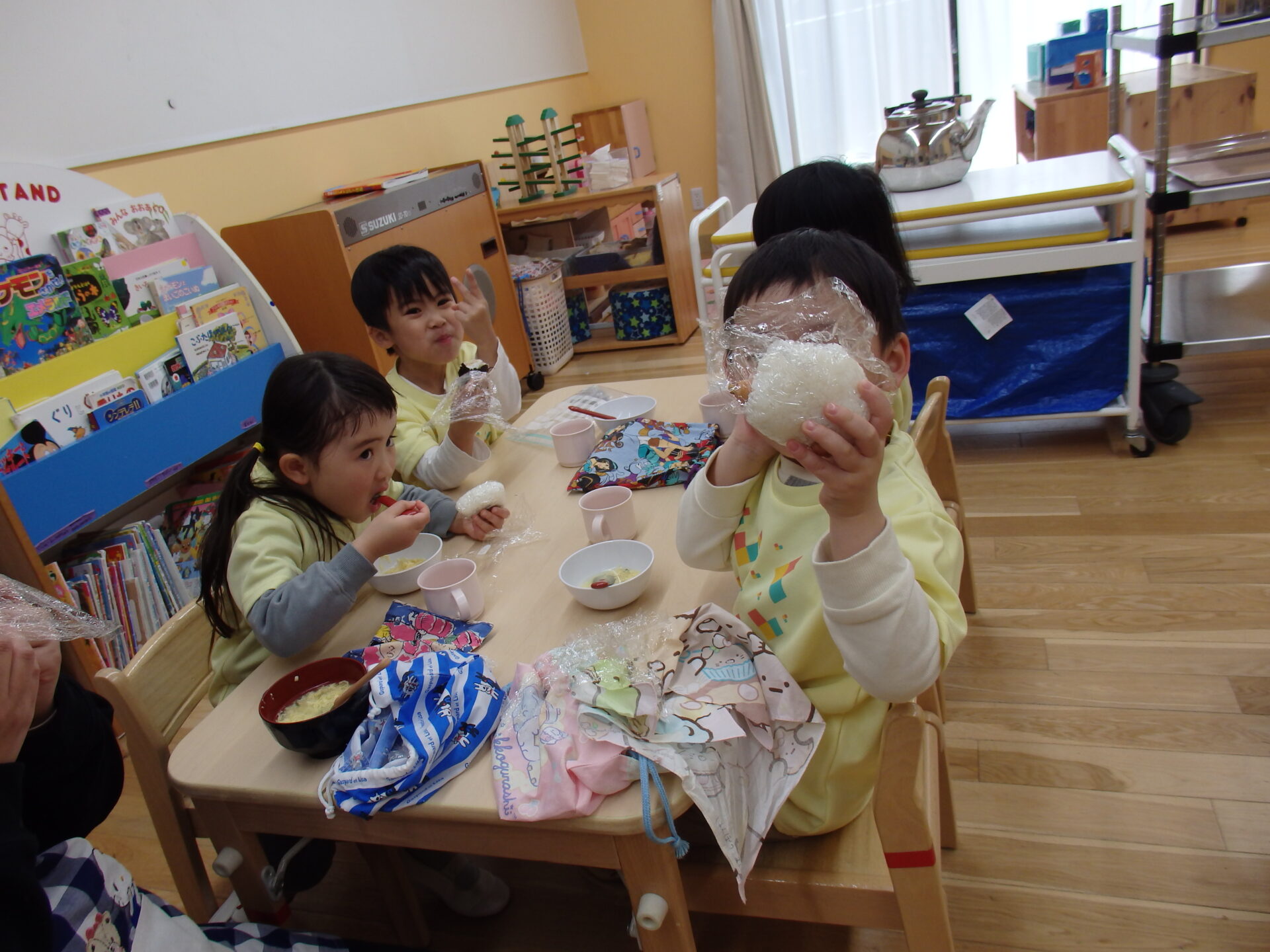 園に戻ってからは、お待ちかねのおにぎりお弁当を食べました。