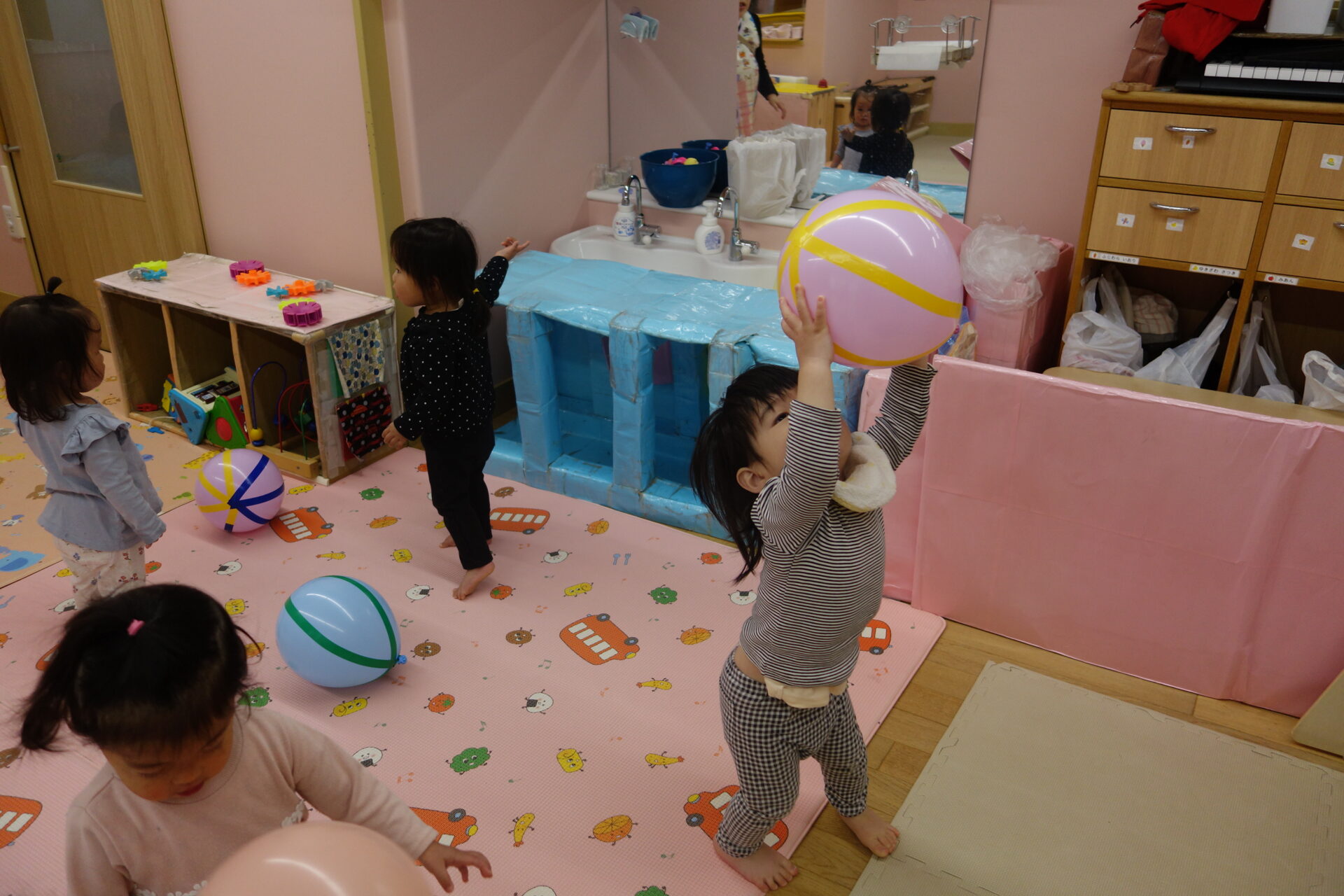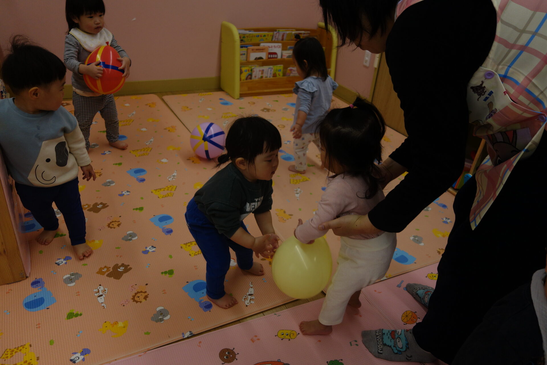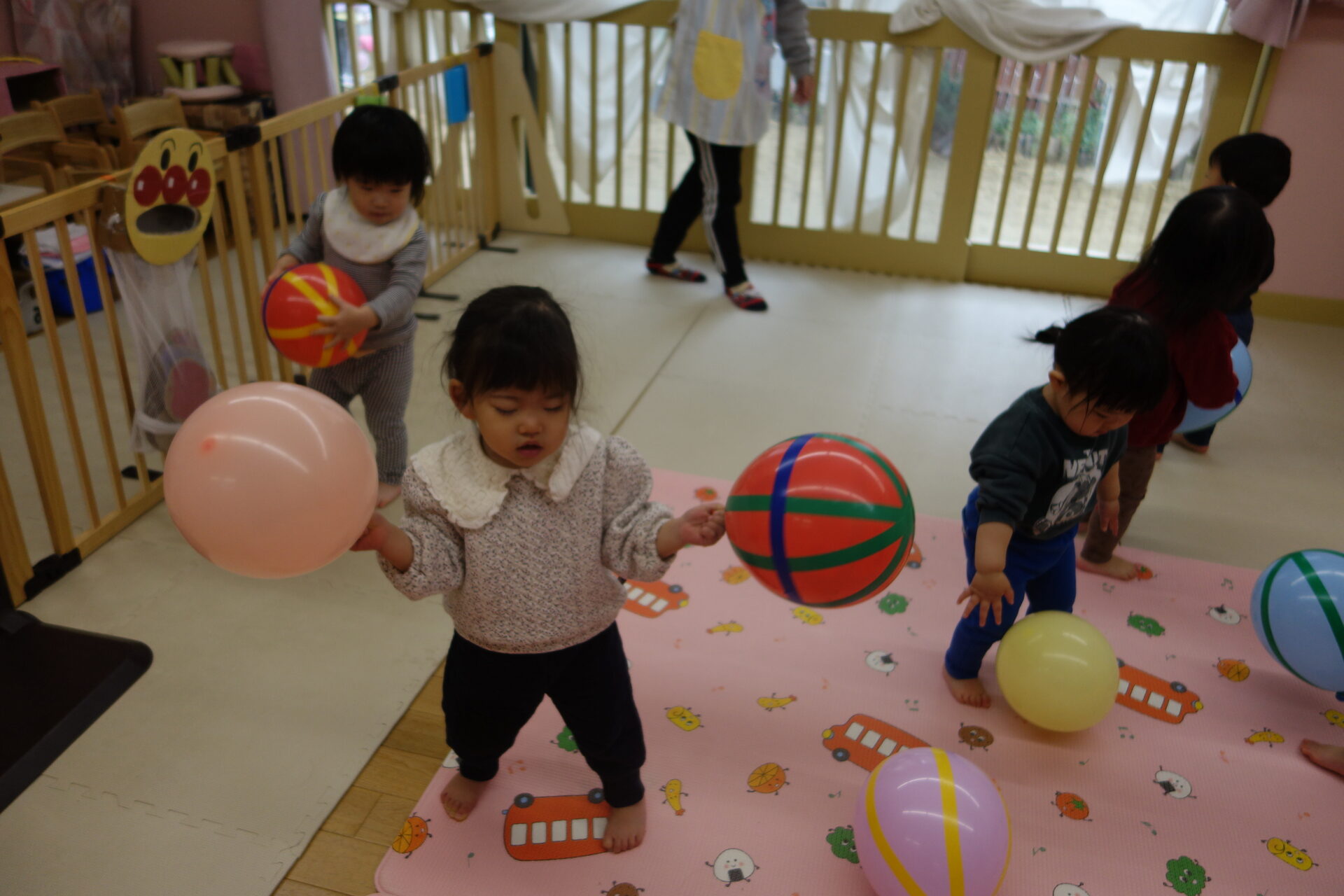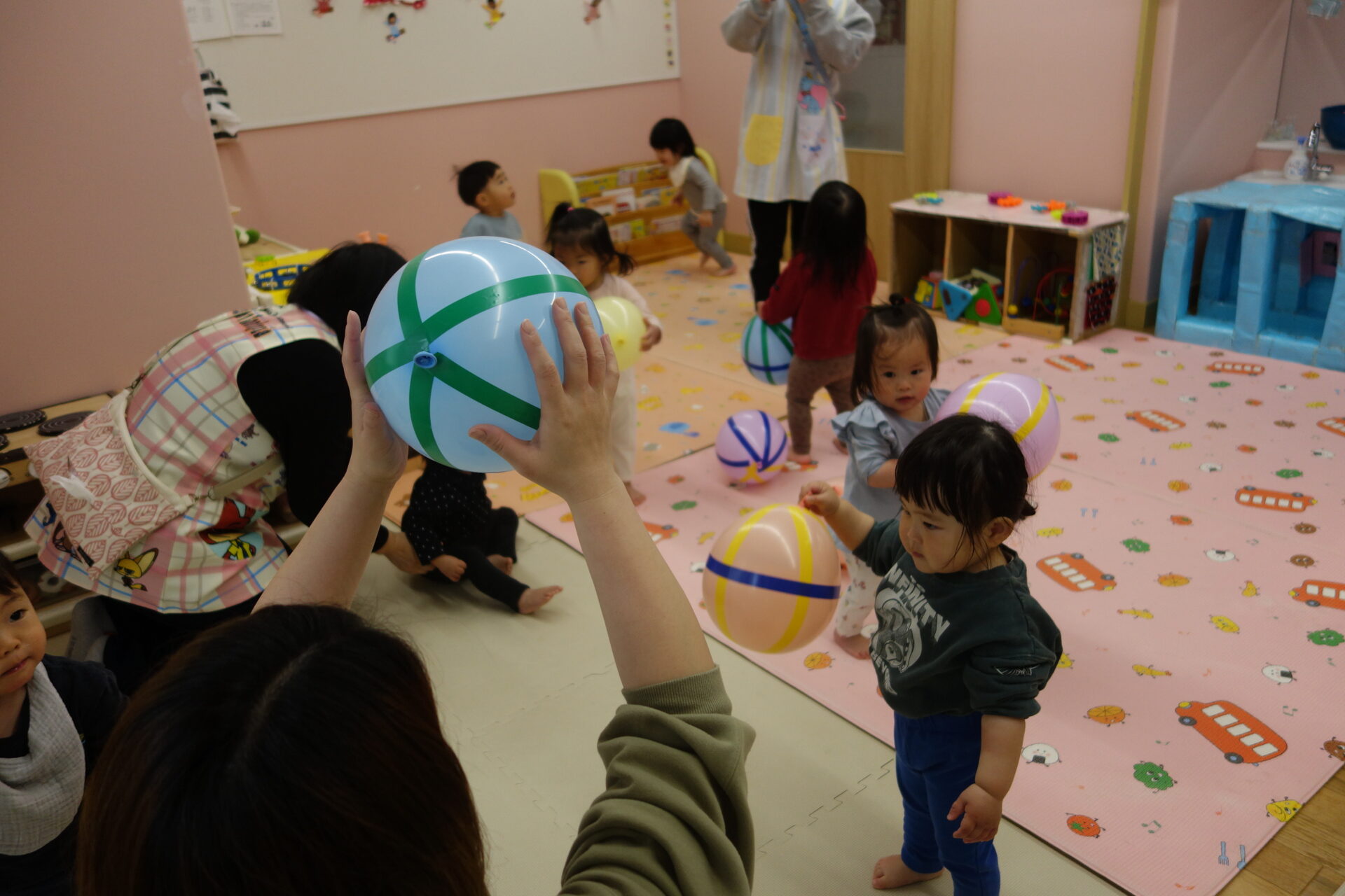 「ポーン」と言いながらボールのように投げる子や、両手に風船を持ち「ふりふり♪」と言いながら、振って遊ぶ子もいました。