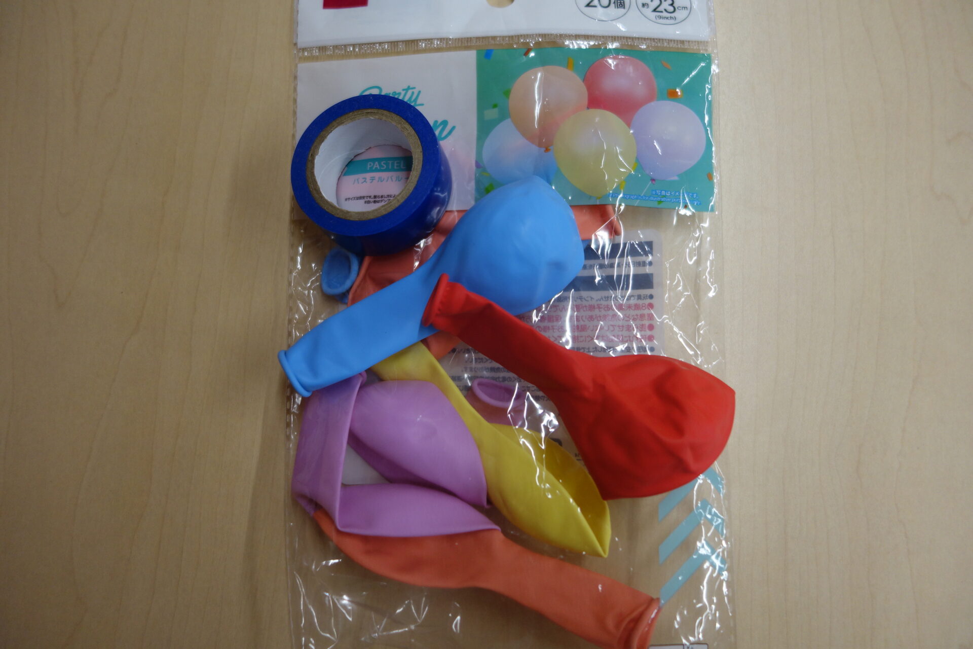 風船とビニールテープを用意して、膨らました風船に縦4本ビニールテープを貼ると、