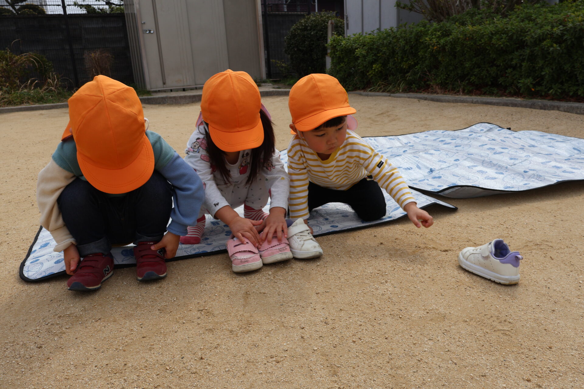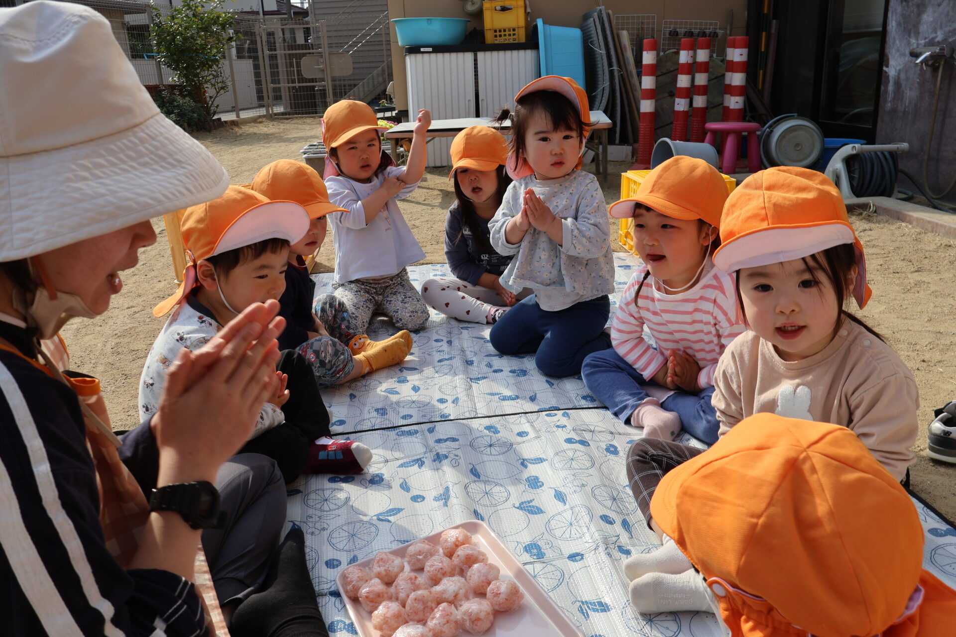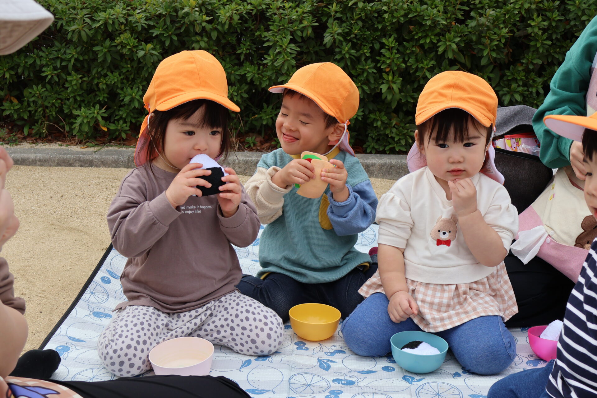 ついに本物の「おにぎり」を園庭で食べました!お外でみんなの顔を見ながら食べるおにぎりは、いつも以上に美味しくおかわりもして食べてくれました😊靴を並べる事をしっかり覚えていました。