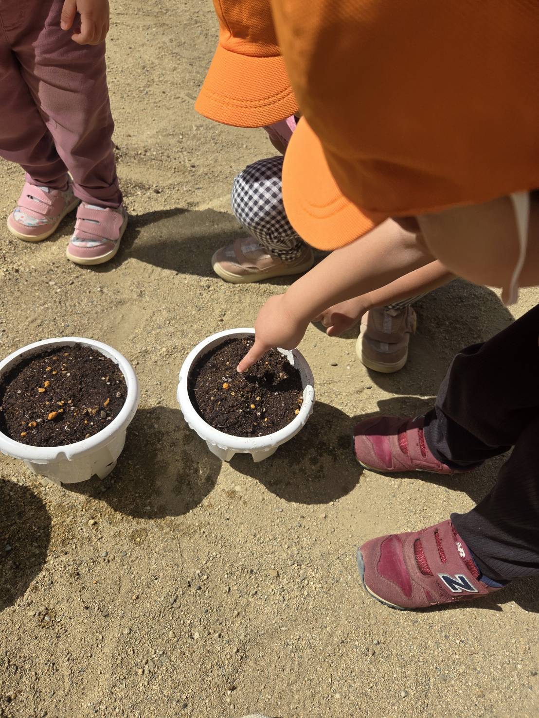 小さな植木鉢の中に種を植える準備をしていると、お手伝いに来てくれた子に