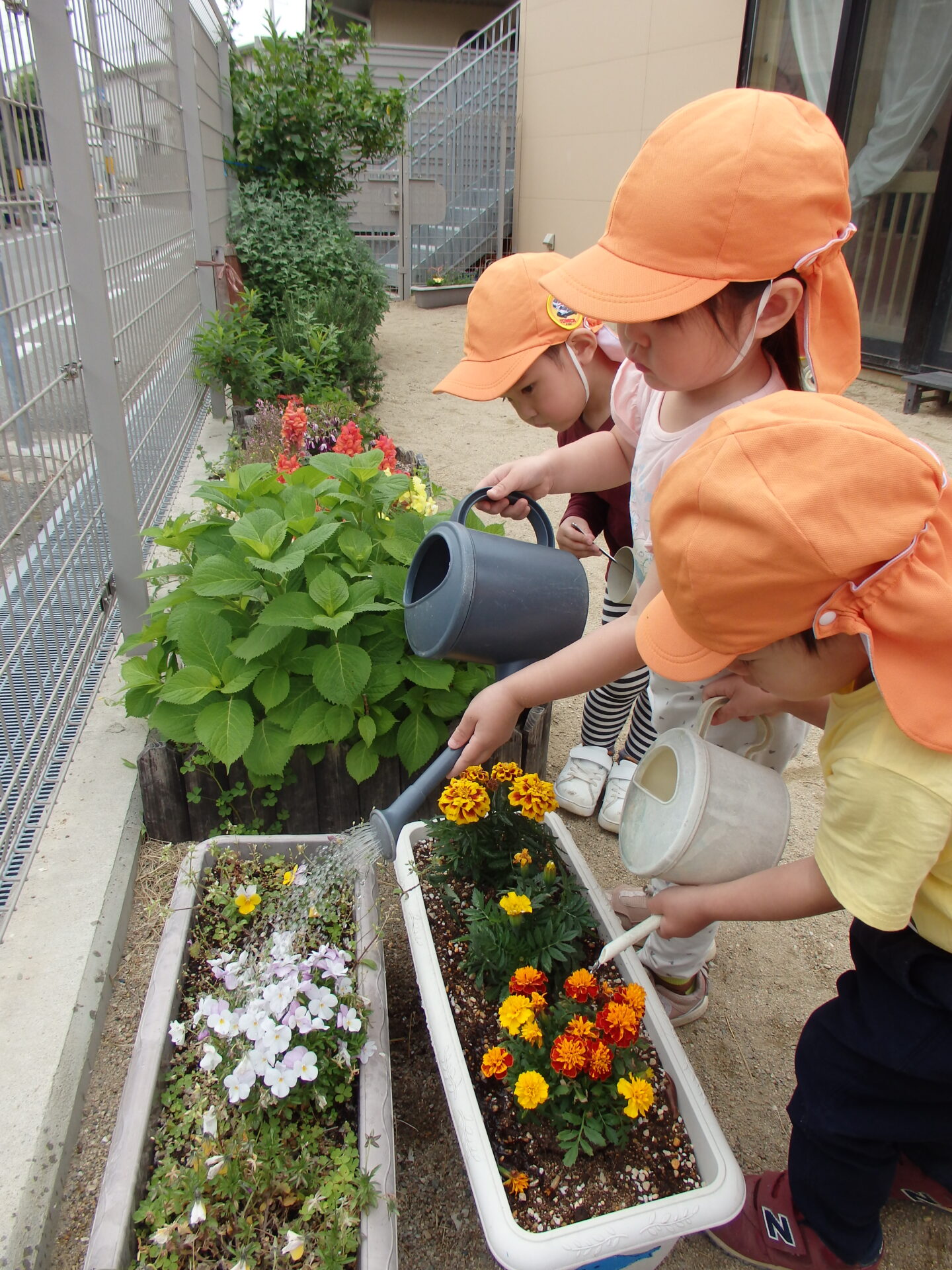 園庭に出るたびに花壇やプランターの花に興味を持ち、お水をあげたり