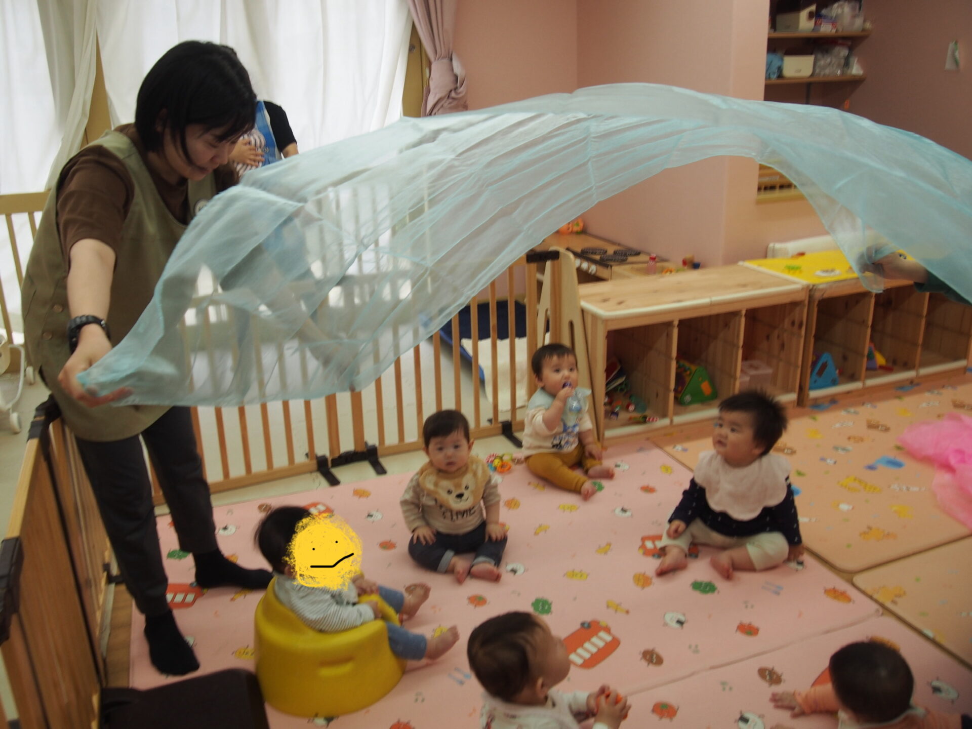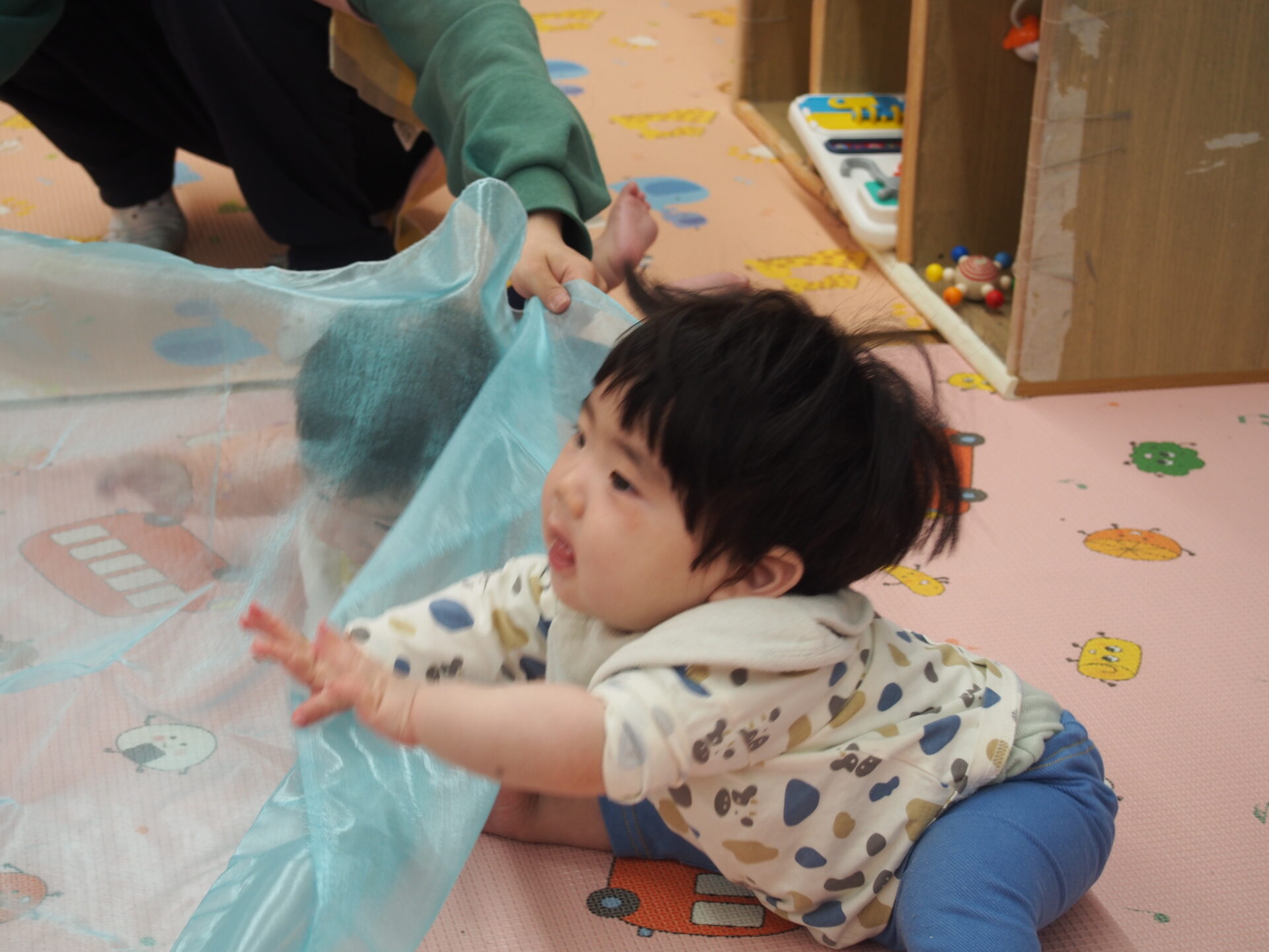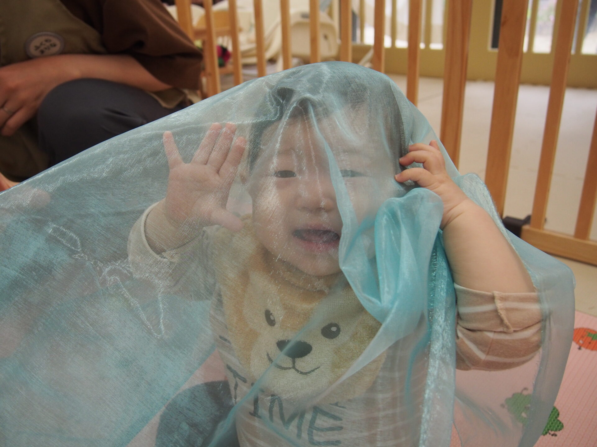 布を興味津々で掴んでみたり、布越しの不思議な視界を味わったりとそれぞれの楽しみ方を発見する子どもたちでした☺️