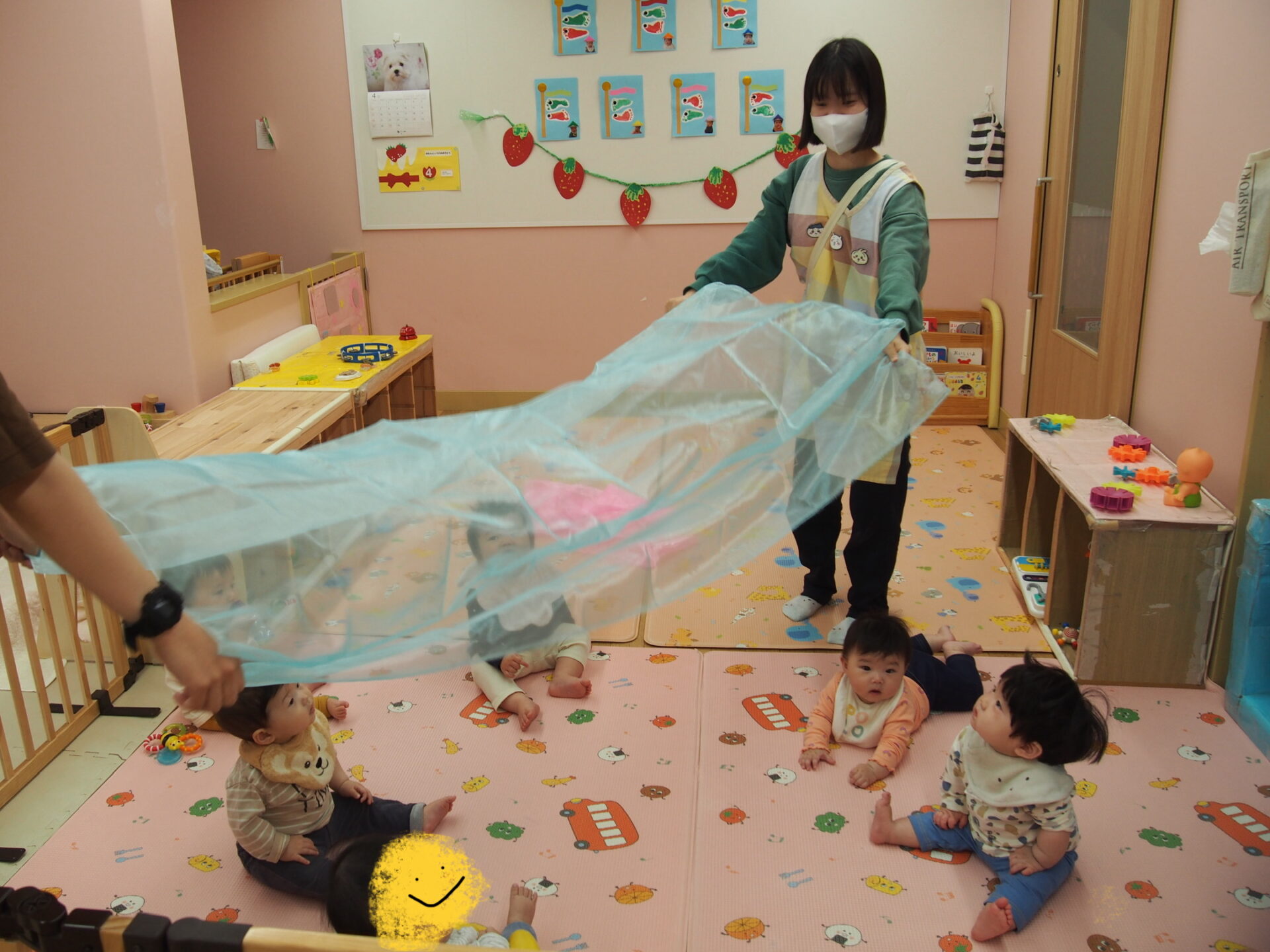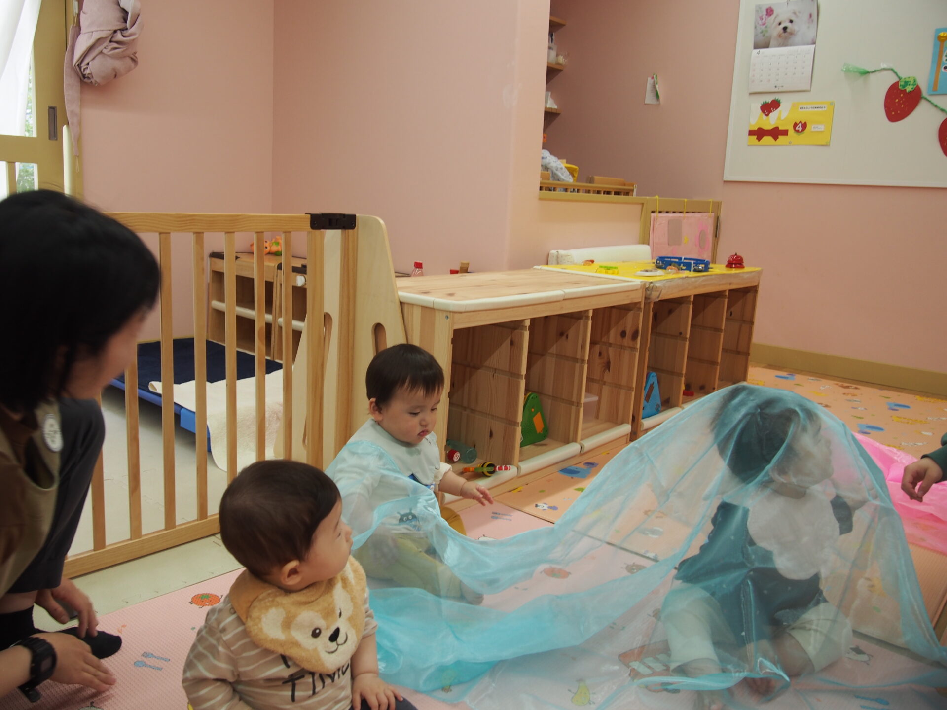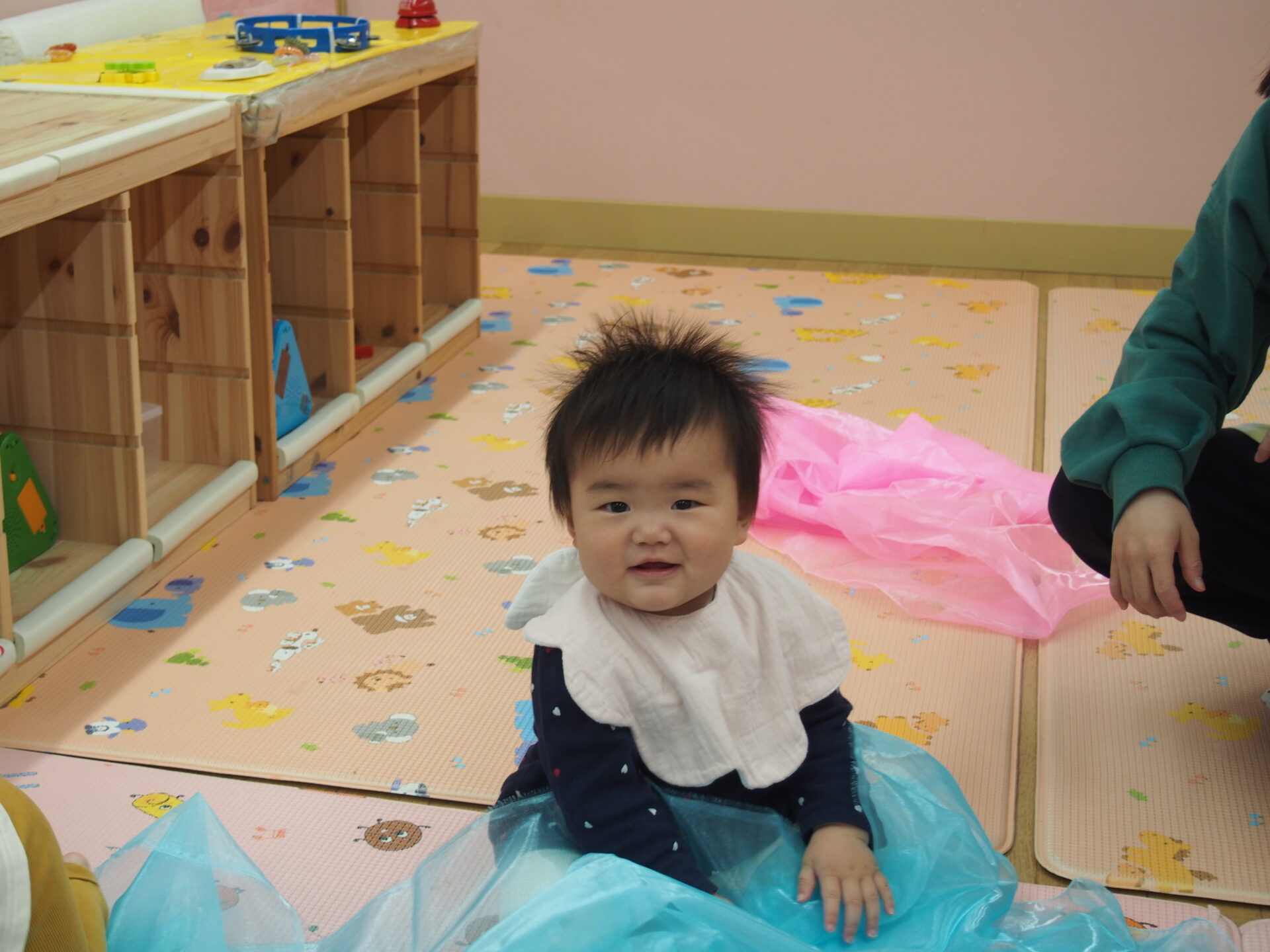 布を興味津々で掴んでみたり、布越しの不思議な視界を味わったりとそれぞれの楽しみ方を発見する子どもたちでした☺️
