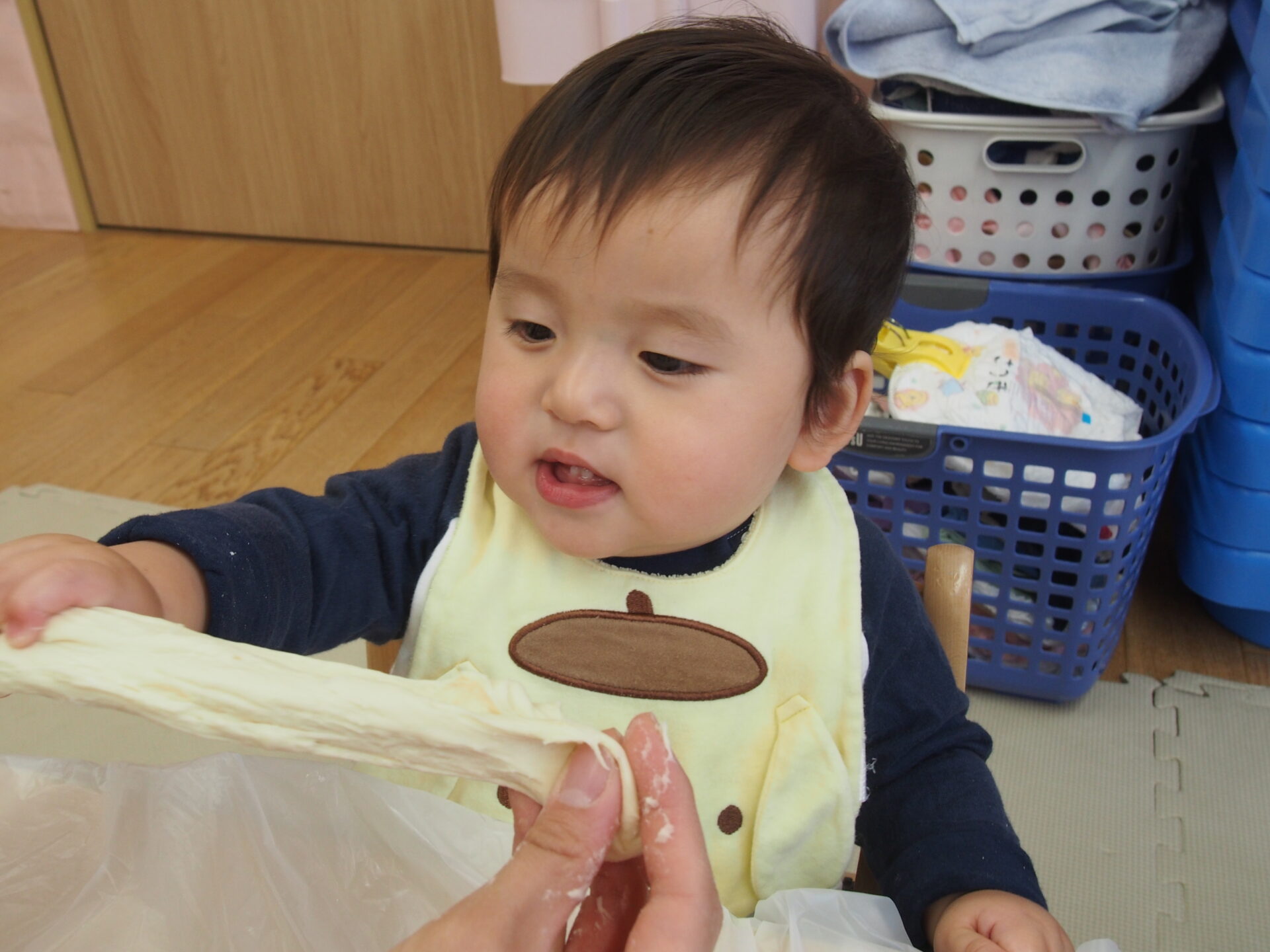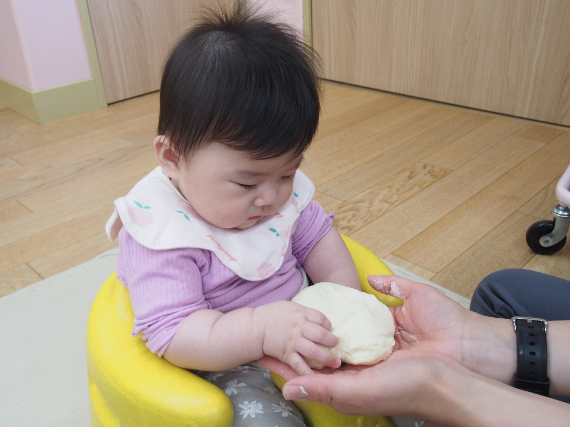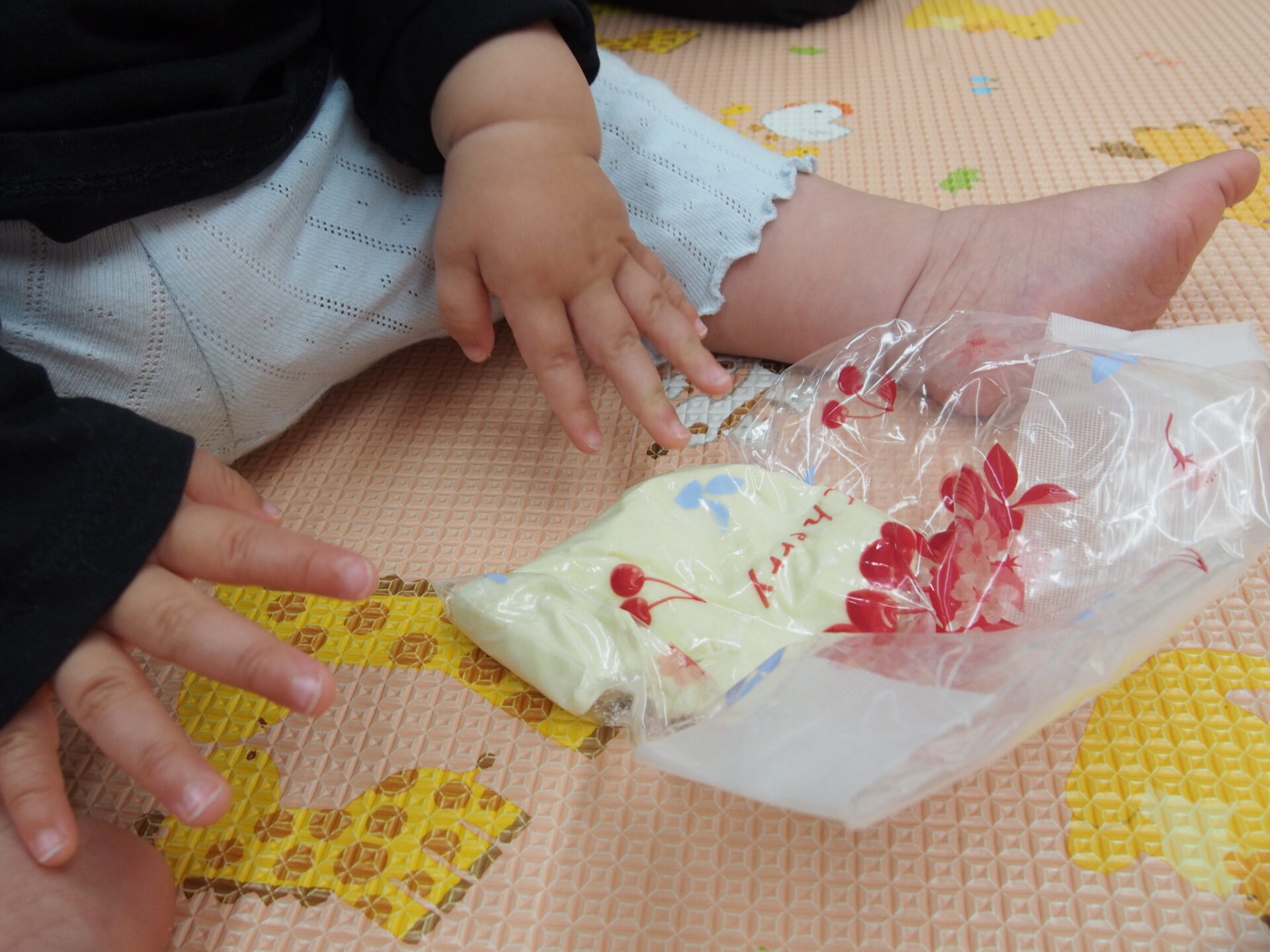 小麦粉粘土を触ってみたよ(0歳児)