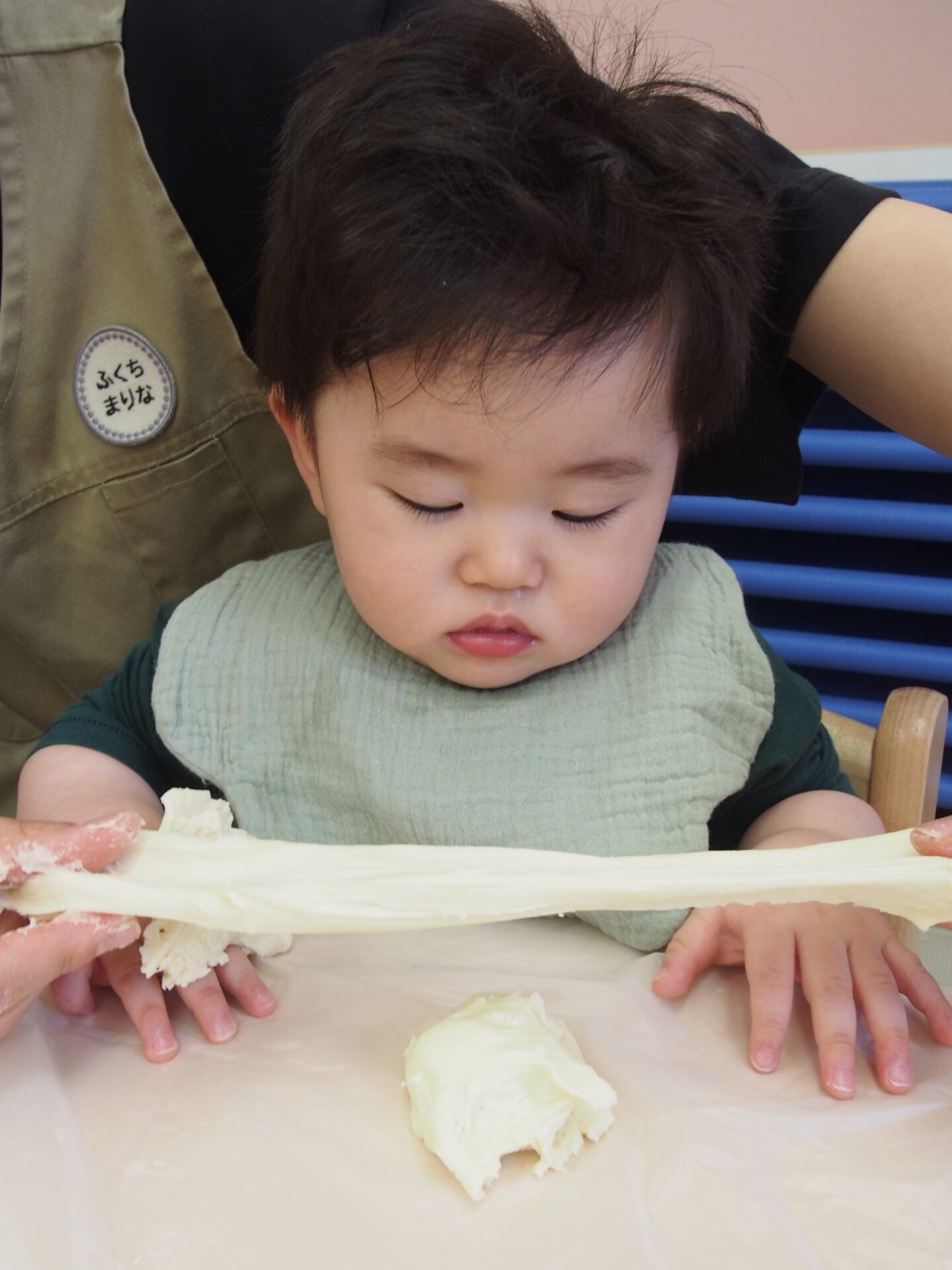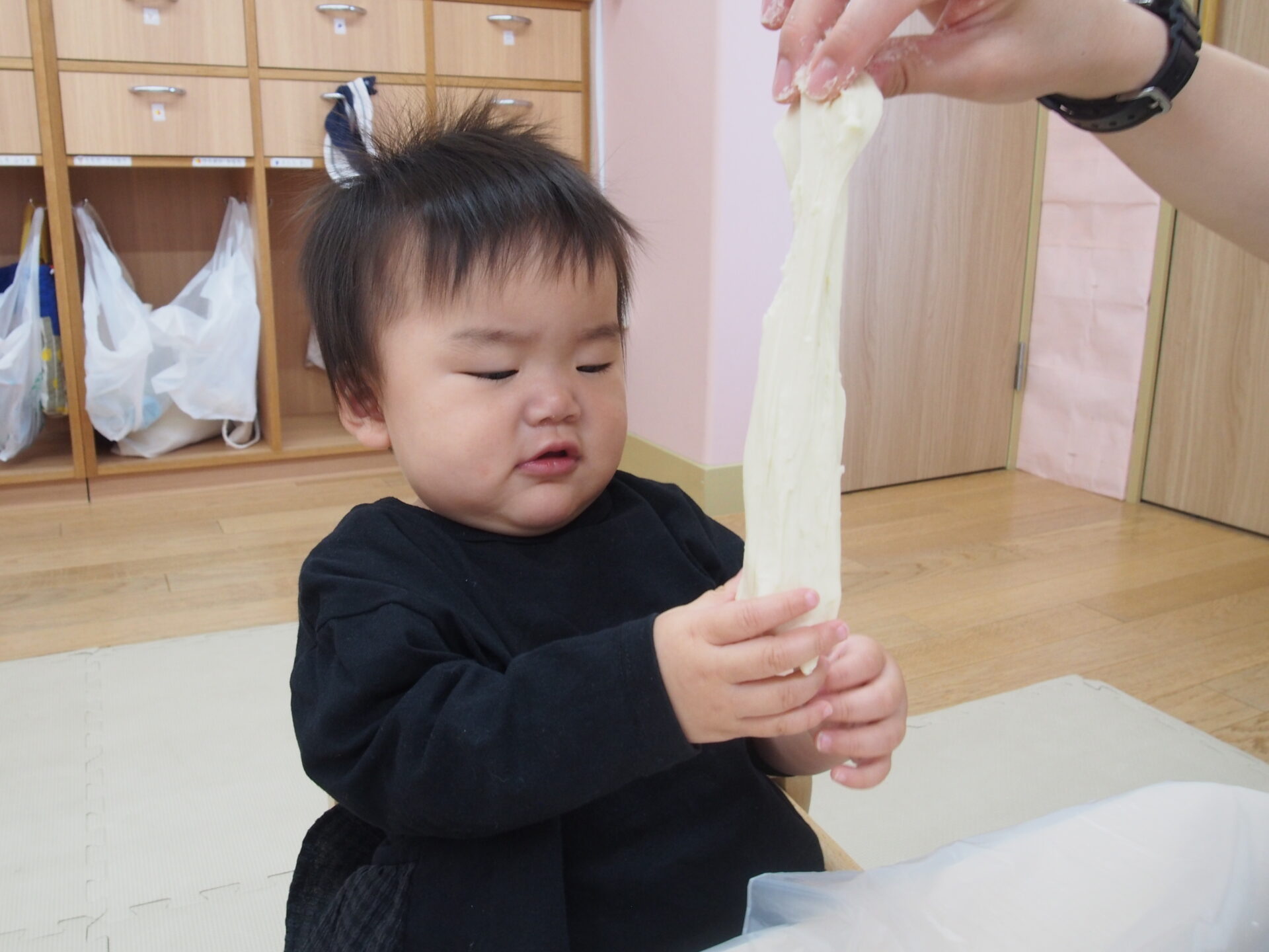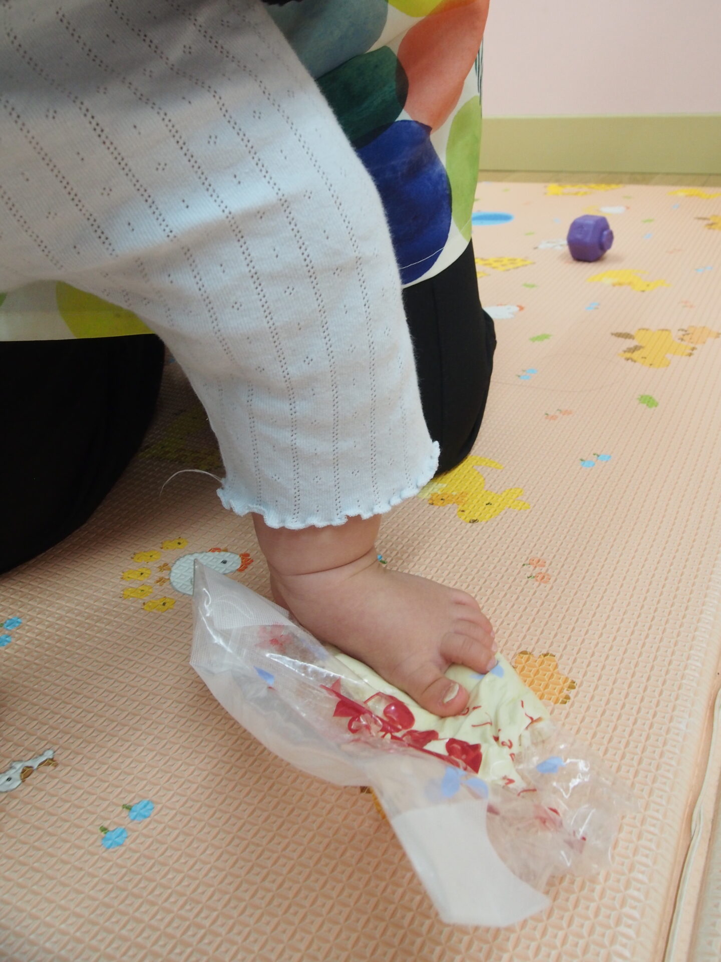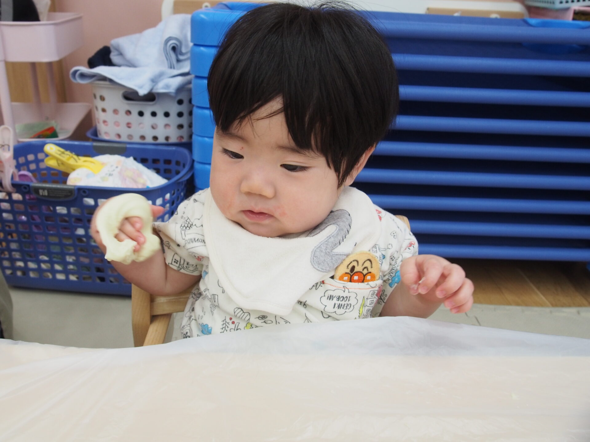 小麦粉粘土を触ってみたよ(0歳児)
