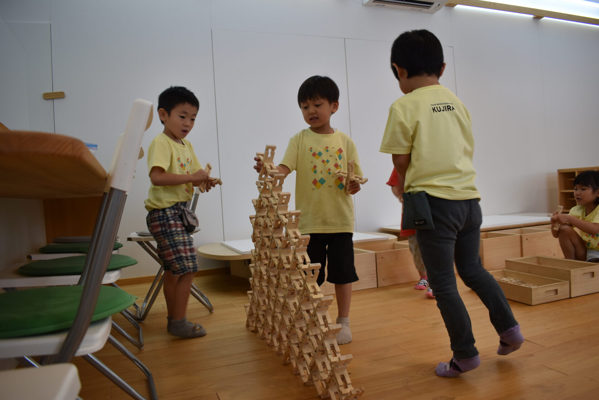 ”組み木”は保育園にもありますが、この場所にはたくさん置いているので、崩れそうになりながらも普段よりも大きく組み立てる事ができました!
