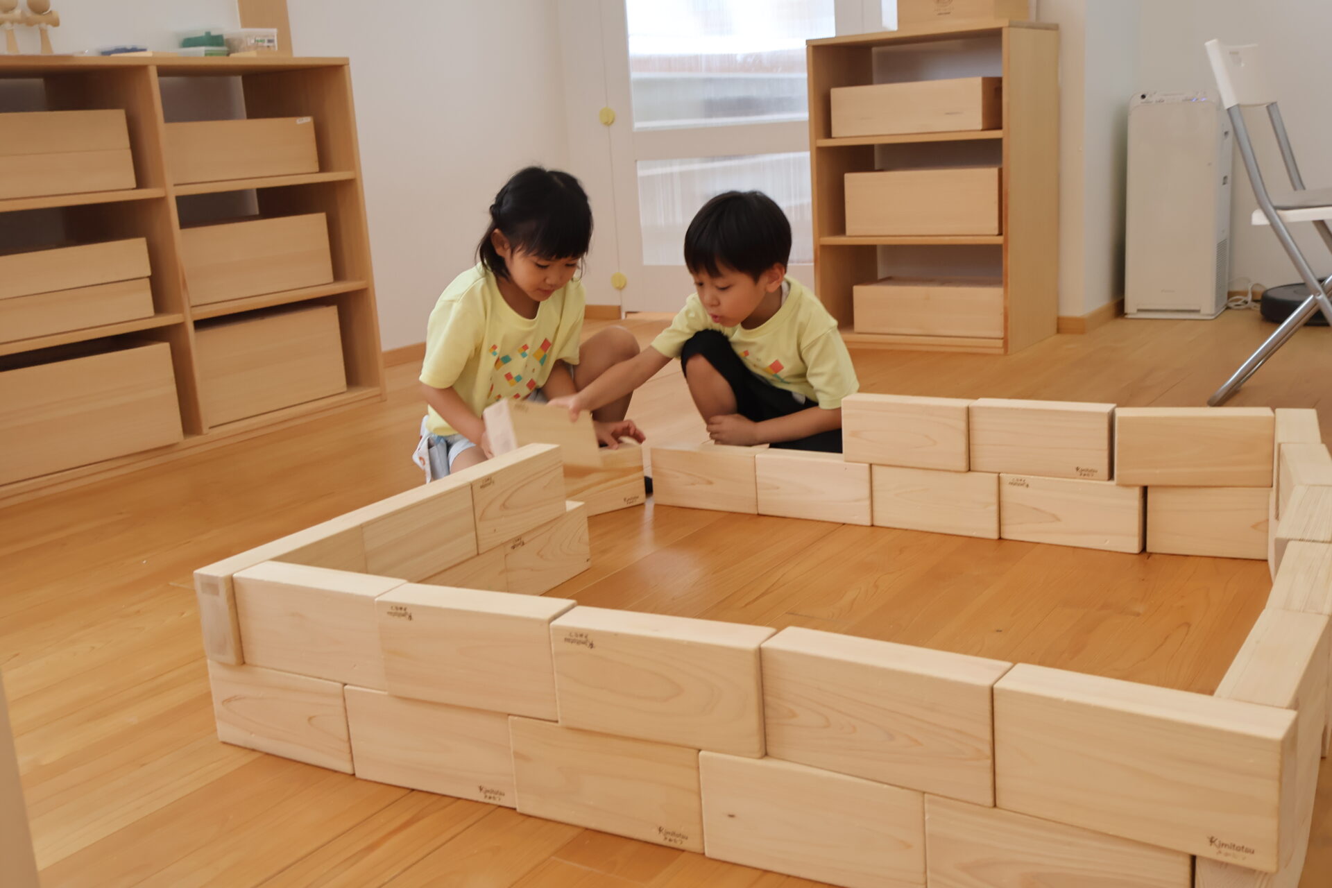 大きな積み木を見つけると、「家作ろうよ!」と友だちを誘って組み立て始めました。
