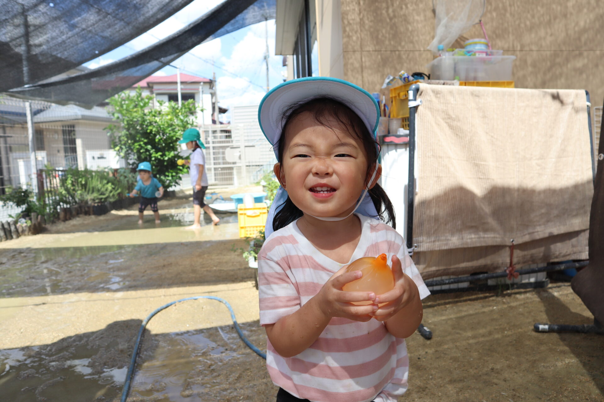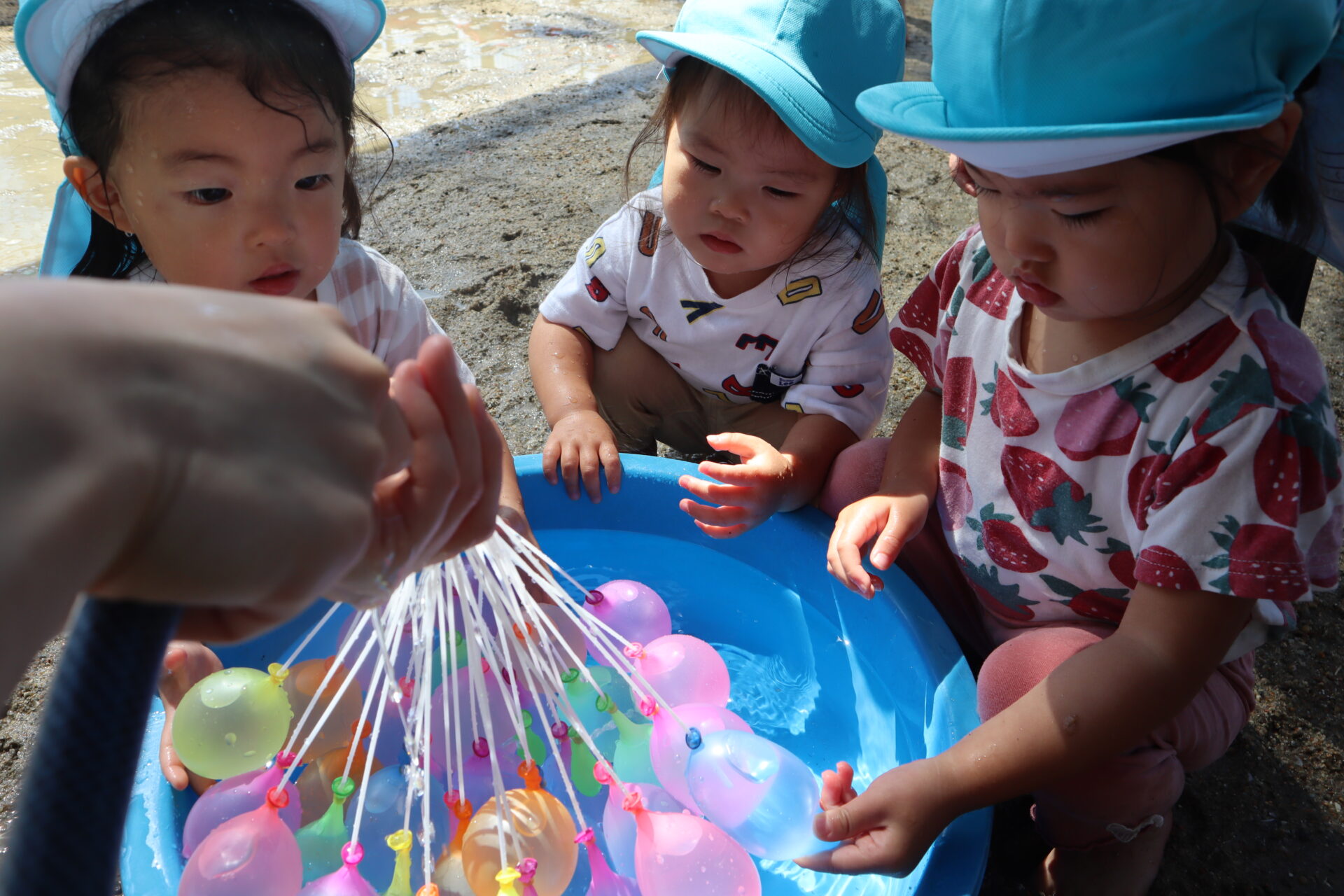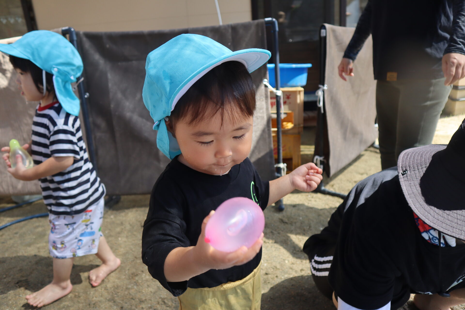 また友達と持っている水風船の色が同じなことに気づくと、「一緒だね〜」と顔を見合わせて嬉しそうに笑い合う子ども達でした。