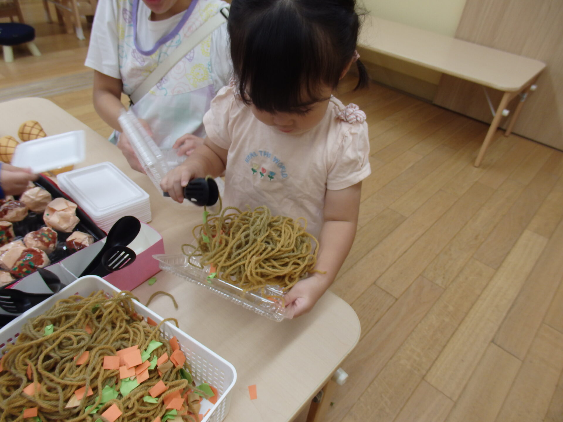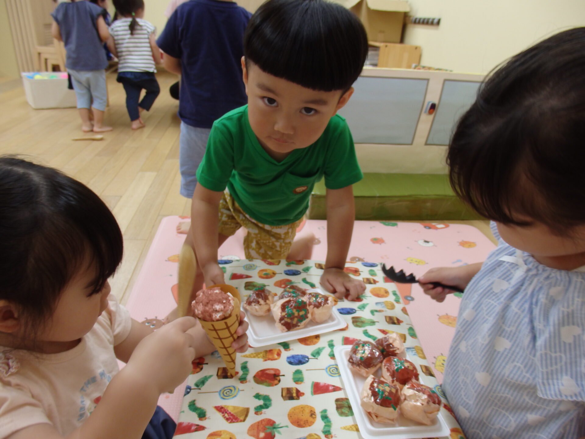 「美味しね。」「一個あげるね」など感想を言いあったり、スプーンやコップをままごとコーナーから持ってきたり、遊び方も本格的な様子が見られました。